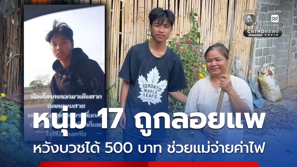หนุ่มวัย 17 ปี หวังได้เงินจากเงินบวช 500 บาท มาช่วยแม่จ่ายค่าไฟ แต่ลูกลอยแพ ตัดสินใจเดินเท้ากลับบ้านระยะทาง 80 กิโลเมตร โชคดีพลเมืองดีเห็นช่วยส่งถึงบ้านปลอดภัย ยันไม่ยุ่งเกี่ยวยาเสพติด อยากทำงานหาเงินจุนเจือครอบครัวยากจน
