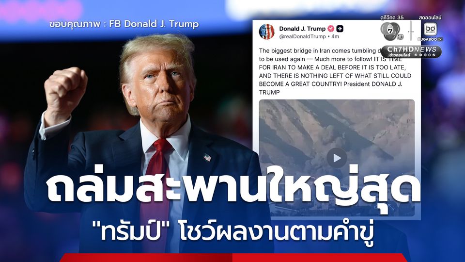 หลังจากนายโดนัล ทรัมป์ ประธานาธิบดีสหรัฐฯ โพสต์ภาพวีดีโอ ปฏิบัติการโจมตีอิหร่าน ด้วยการถล่มสะพานที่ใหญ่ที่สุด พร้อมข้อความเตือนไปถึงอิหร่าน หากยังไม่ยอมทำข้อตกลงเพื่อสงบศึก จะต้องโดนมากกว่านี้