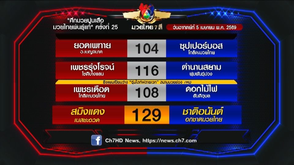 โปรแกรมมวยไทย 7 สี วันอาทิตย์ที่ 5 เมษายน 2569 ถ่ายทอดสดช่อง 7HD เวลา 14.30 น.