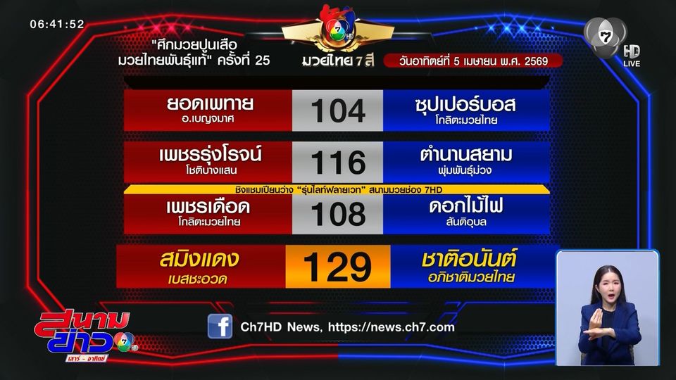 โปรแกรมมวยไทย 7 สี วันอาทิตย์ที่ 5 เมษายน 2569 ถ่ายทอดสดช่อง 7HD เวลา 14.30 น.