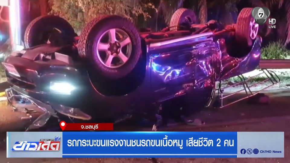 ข่าวเด็ด 7 สี - ที่จังหวัดชลบุรี รถกระบะบรรทุกแรงงานจะไปขึ้นเรือ ฝ่าไฟแดงชนกับรถบรรทุกหมู รถกระบะบรรทุกแรงงานพลิกคว่ำ เสียชีวิต 2 คน บาดเจ็บ 7 คน