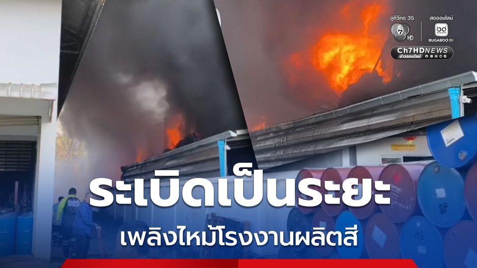 เสียงระเบิดเป็นระยะ ๆ เกิดเหตุเพลิงไหม้โรงงานผลิตสี ในพื้นที่กระทุ่มแบน เพลิงยังโหมลุกไหม้ เจ้าหน้าที่ระดมกำลังฉีดน้ำสกัด และทำงานด้วยความยากลำบาก เนื่องจากมีสารเคมีทินเนอร์