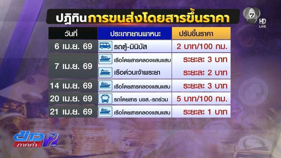 วันที่ 20 เมษายน รถโดยสาร บขส. - รถร่วม จะปรับขึ้นราคาเช่นกัน ในอัตรา 5 บาท ต่อ 100 กิโลเมตร โดยในระหว่างวันที่ 6-19 เมษายน บขส. ยังช่วยตรึงราคาค่าตั๋ว ให้คนเดินทางกลับบ้านในช่วงเทศกาลสงกรานต์อยู่ และในวันที่ 21 เมษายน เรือคลองแสนแสบ ขอปรับราคาขึ้นอีกระยะละ 1 บาท