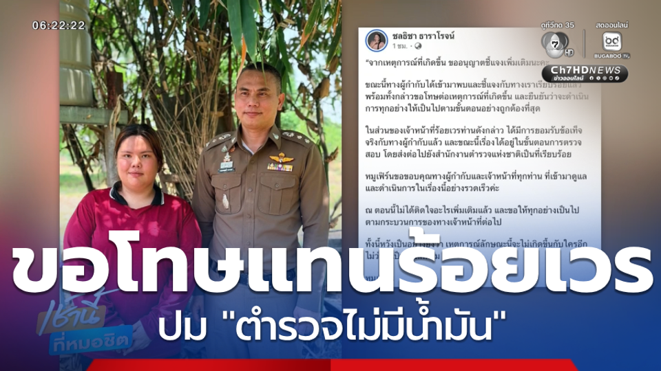 เช้านี้ที่หมอชิต - กรณีอินฟลูฯ สาวโพสต์คลิป "ตำรวจไม่มีน้ำมัน" จึงเดินทางมาดูเหตุโจรขึ้นบ้านญาติของเธอไม่ได้ ต่อมาทาง สภ.ม่วงสามสิบ จังหวัดอุบลราชธานี ออกมาชี้แจง พร้อมกับการตั้งกรรมการสอบสวนข้อเท็จจริง และล่าสุดช่วงบ่ายเมื่อวานนี้ ผู้กำกับ สภ.ม่วงสามสิบ มาพบผู้เสียหายด้วยตนเอง พร้อมชี้แจงและกล่าวขอโทษ