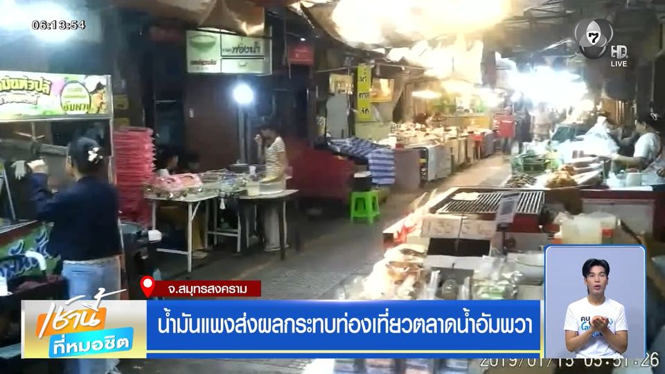 เป็นสภาพของตลาดน้ำอัมพวา อำเภออัมพวา จังหวัดสมุทรสงคราม ที่บรรยากาศเงียบเหงากว่าปกติ แม้จะเป็นช่วงวันหยุดติดต่อกัน 3 วัน เป็นผลกระทบที่มาจากน้ำมันที่แพงขึ้น และส่งผลกระทบกับพ่อค้าแม่ค้าในตลาดน้ำแห่งนี้ รวมไปถึงโฮมสเตย์และห้องพักที่เงียบเหงา โดยพ่อค้าแม่ค้าอยากให้รัฐบาลช่วยเหลือ หาวิธีทำให้ราคาน้ำมันลดต่ำลงกว่านี้