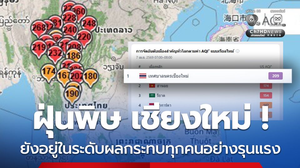 วันนี้ (7 เม.ย.69) เว็บไซต์ IQAir จัดอันดับคุณภาพอากาศตามเมืองสำคัญของโลก ช่วงเวลา 07.00 น.-08.00 น. เชียงใหม่อยู่อันดับหนึ่งเมืองที่มีมลพิษมากที่สุดในโลก อยู่แถบในระดับสีม่วงมีผลกระทบต่อทุกคนอย่างรุนแรง โดยแม่ฮ่องสอน หลายอำเภอมีฝุ่นพิษมากที่สุดในภาคเหนือ