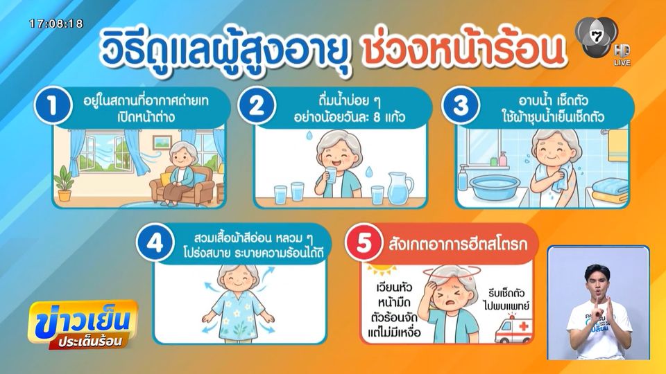 เรื่องราวของคุณยายเป็นอุทาหรณ์ ที่ย้ำเตือนภัยจากอากาศร้อนที่ลูกหลานได้ช่วยกันดูแลผู้สูงอายุที่บ้าน ให้มีวิธีคลายร้อน เริ่มจากการให้ผู้สูงอายุ อยู่ในสถานที่อากาศถ่ายเท สะดวก เปิดประตูหน้าต่างระบายอากาศให้ดี ให้มีลมถ่ายเท ดื่มน้ำให้เพียงพออย่างน้อยวันละ 8 แก้ว ป้องกันภาวะขาดน้ำ การอาบน้ำและเช็ดตัว ช่วยคลายความร้อนได้ แล้วให้สวมเสื้อผ้าสีอ่อน ๆ ที่โปร่ง หลวม ๆ ระบายคลายร้อน อากาศได้ดี หลีกเลี่ยงแดดจัด และหน้าร้อนต้องระวังสังเกตอาการฮีตสโตรก ถ้าเวียนหัว หน้ามืด ตัวร้อนจัดแต่ไม่มีเหงื่อ ให้รีบเช็ดตัวและไปพบแพทย์