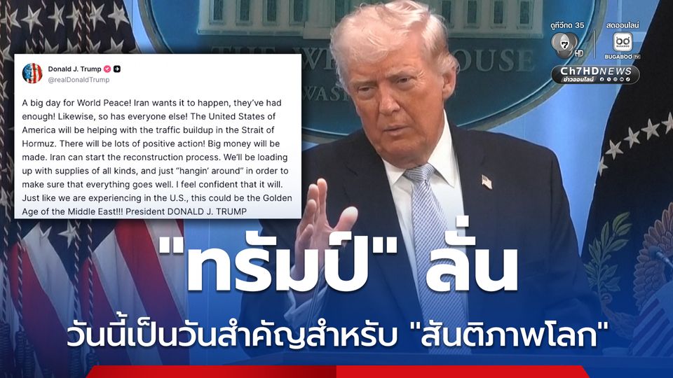“โดนัลด์ ทรัมป์” ประกาศ วันนี้เป็นวันสำคัญสำหรับ “สันติภาพโลก” ให้อิหร่านเริ่มต้นกระบวนการฟื้นฟูประเทศได้เลย และทางสหรัฐฯ จะจัดส่งเสบียงทุกชนิดไปให้ และนี่อาจจะกลายเป็น “ยุคทองของตะวันออกกลาง”