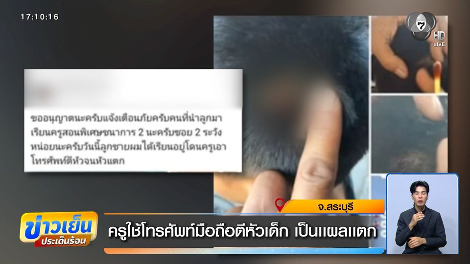 ข่าวเย็นประเด็นร้อน - พ่อแม่ส่งลูกไปเรียนพิเศษ หวังจะมีความรู้ แต่ปรากฏว่า ครูสอนพิเศษใช้โทรศัพท์มือถือตีเข้าหัวเด็กจนแตก งานนี้ผู้ปกครองไม่ยอม เตรียมดำเนินคดีถึงที่สุด