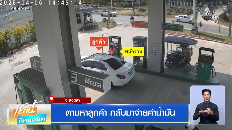 กล้องวงจรปิดบันทึกภาพขณะลูกค้า ขับรถเก๋งสีขาวเข้ามาเติมน้ำมันหลังพนักงานเติมน้ำมันเสร็จ ลูกค้าได้ขอสแกนจ่าย ขณะพนักงานของเดินไปดูยอดเงินที่ตู้แคชเชียร์ ลูกค้ากลับขับรถออกไปจากปั๊มทันที โดยที่เงินยังไม่เข้า เหตุเกิดที่ปั๊มน้ำมันริมถนนปุณณกัณฑ์ ตำบลทุ่งใหญ่ อำเภอหาดใหญ่ จังหวัดสงขลา