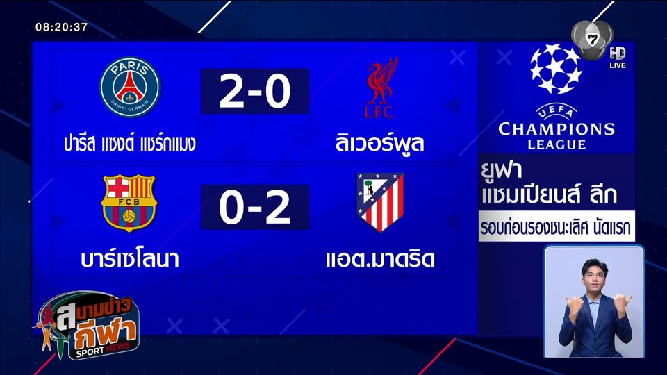 ปารีส แซงต์ แชร์กแมง แชมป์เก่า ชนะ ลิเวอร์พูล 2-0 ได้ประตูจาก เดซิเร่ ดูเอ้ นาทีที่ 11 และ ควิชา ควารัตสเคเลีย นาทีที่ 65 บาร์เซโลนา เหลือ 10 คน แพ้ แอต.มาดริด 0-2