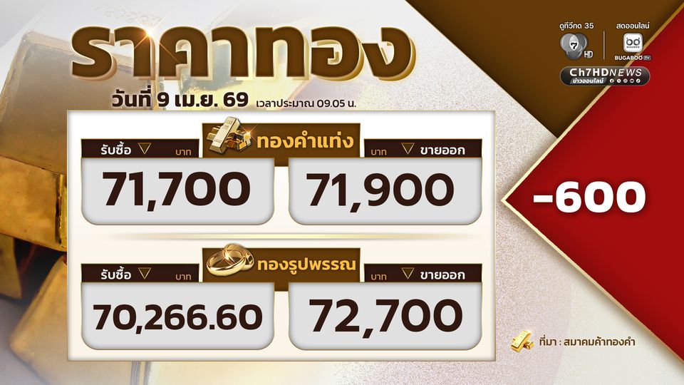 ราคาทอง โดยสมาคมค้าทองคำ รายงานราคาทองวันนี้ (9 เม.ย. 69) เปิดตลาดราคาทองปรับลง 600 บาท ขายออกที่บาทละ 71,900 บาท โดยทองคำแท่งรับซื้อที่ 71,700 บาท ขายออกที่ 71,900 บาท ทองรูปพรรณรับซื้อที่ 70,266.60 บาท ขายออก 72,700 บาท