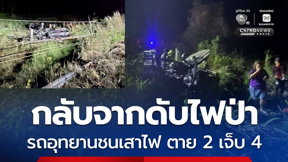 อุบัติเหตุสลด รถกรมอุทยานฯ ขนเจ้าหน้าที่กลับจากภารกิจดับไฟป่า เสียหลักโค้งหัดศอกชนเสาไฟฟ้า เสียชีวิต 2 คน เจ็บอีก 4 คน