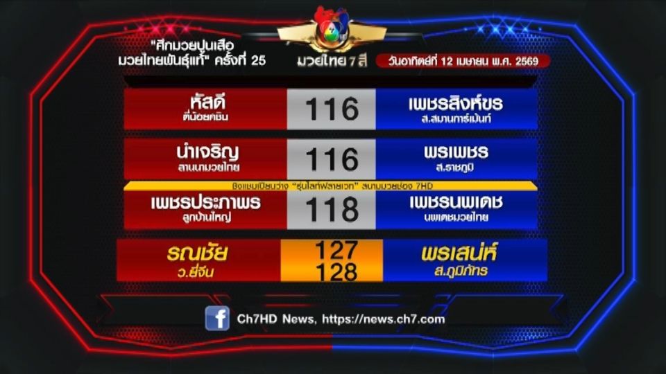 โปรแกรมมวยไทย 7 สี วันอาทิตย์ที่ 12 เมษายน 2569 ถ่ายทอดสดช่อง 7HD เวลา 14.30 น.