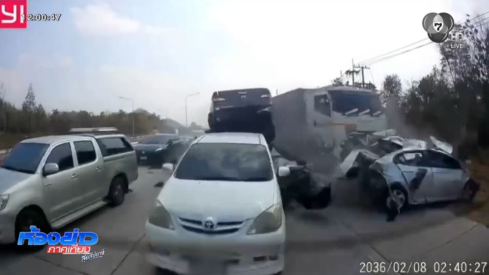 ห้องข่าวภาคเที่ยง สุดสัปดาห์ - ไปดูภาพจากกล้องหน้ารถ ที่บันทึกวินาทีชีวิตของอุบัติเหตุรถพ่วง 18 ล้อวิ่งมาด้วยความเร็ว แทบไม่เบรก ก่อนพุ่งชนรถด้านหน้าอย่างรุนแรง จนรถเก๋งลอยขึ้นกลางอากาศต่อหน้าต่อตา