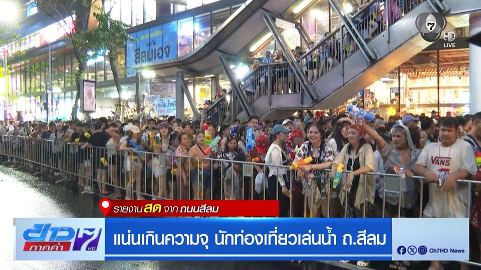 ข่าวภาคค่ำ - นักท่องเที่ยวทั้งชาวไทย และต่างชาติ พากันมาเล่นน้ำสงกรานต์ ที่ถนนสีลมอย่างเนืองแน่นตั้งแต่นาทีแรก เที่ยงวัน ที่ปิดการจราจร และยาวต่อเนื่องจนถึงเวลาสุดท้าย 20.00 น. ก่อนเจ้าหน้าที่จะเข้าเคลียร์พื้นที่ บรรยากาศความสนุกสนานเป็นอย่างไร ติดตามกับคุณเกียรติชัย บุญราโส รายงานสดจาก ถนนสีลม