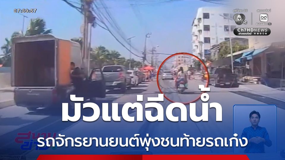 สนามข่าว 7 สี - กลุ่มเด็กหญิงขี่รถจักรยานยนต์นั่งซ้อนมากัน 3 คน มัวแต่ใช้ปืนฉีดน้ำสงกรานต์อย่างสนุกสนาน ไม่มองทาง รถพุ่งชนท้ายรถเก๋งอย่างจัง