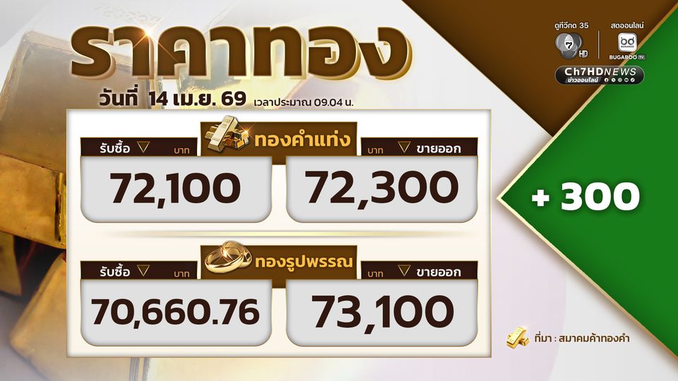 ราคาทอง โดยสมาคมค้าทองคำ รายงานราคาทองวันนี้ (14 เม.ย. 69) เปิดตลาดราคาทอง เพิ่มขึ้น 300 บาท ขายออกที่บาทละ 72,300 บาท โดยทองคำแท่งรับซื้อที่  72,100 บาท ขายออกที่ 72,300 บาท ทองรูปพรรณรับซื้อที่ 70,660.76 บาท ขายออก 73,100 บาท