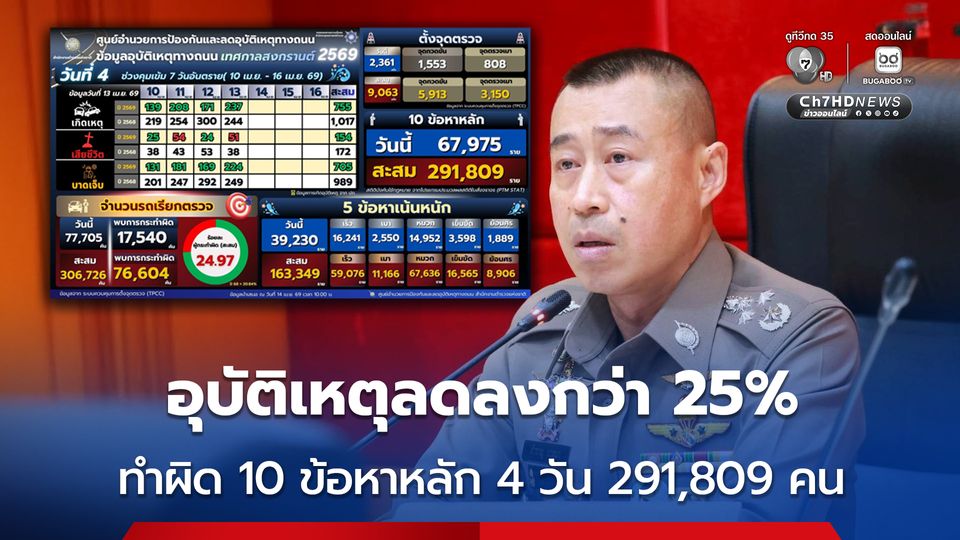 สำนักงานตำรวจแห่งชาติขอบคุณประชาชนร่วมรักษาวินัยจราจรเทศกาลสงกรานต์ สะท้อนจากสถิติอุบัติเหตุลดลงกว่า 25% เผยผู้กระทำผิดใน 10 ข้อหาหลักทั่วประเทศ สะสม 4 วัน 291,809 คน