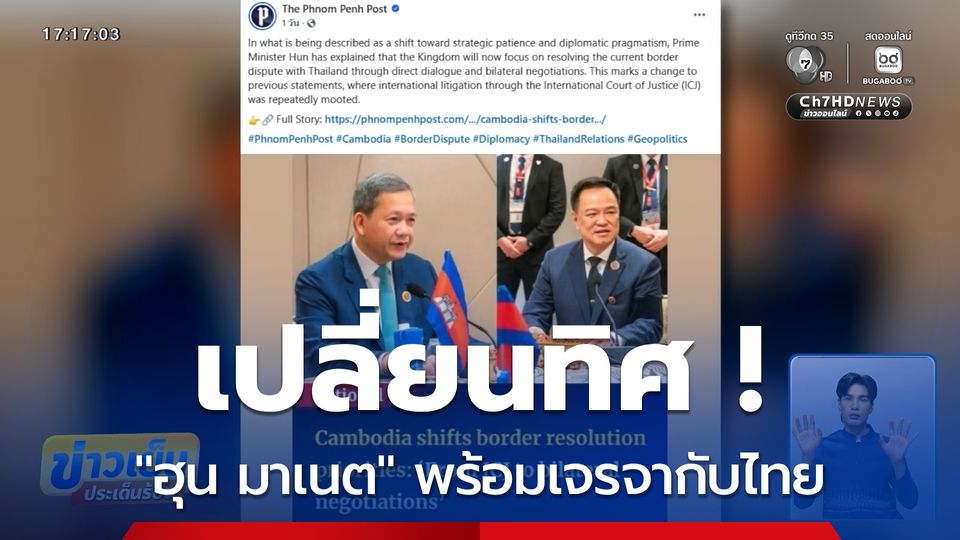 ข่าวเย็นประเด็นร้อน - "นายกฯ ฮุน มาเน็ต" ของกัมพูชา ส่งทั้งสัญญาณ และแสดงท่าทีชัดเจน ว่าจะกลับเข้าสู่เวทีเจรจากับไทย ผ่านการพูดคุย "โดยตรง" และการเจรจาแบบ "ทวิภาคี" ประเด็นนี้ถูกจับตามองในสื่อหลายสำนัก และถูกวิจารณ์หนักจากขั้วตรงข้าม ไปดูกันว่าอะไรทำให้เกิดการเปลี่ยนแปลงได้ขนาดนี้