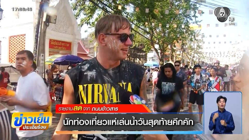ข่าวเย็นประเด็นร้อน - บรรยากาศที่ถนนข้าวสารตอนนี้ ยิ่งเย็นคนยิ่งเยอะ เพราะว่า วันนี้นักท่องเที่ยวแห่ไปเล่นน้ำที่นี่ เพราะวันนี้ถนนสีลมปิด ไม่มีการเล่นน้ำแล้ว ไปติดตามการรายงานสดจาก คุณอนันตชัย วัชรเสถียร