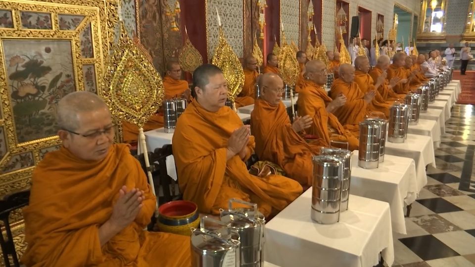 จากนั้น เสด็จออก ณ พระที่นั่งอมรินทรวินิจฉัยทางพระทวารเทวราชมเหศวร โดยมีสมเด็จพระกนิษฐาธิราชเจ้า กรมสมเด็จพระเทพรัตนราชสุดา ฯ สยามบรมราชกุมารี เฝ้าทูลละอองธุลีพระบาทรับเสด็จ โอกาสนี้ ทรงจุดธูปเทียนเครื่องนมัสการพานทองสองชั้นบูชาพระพุทธรูปประจำพระชนมวาร รัชกาลที่ 1 ถึงรัชกาลที่ 9 ที่หน้าพระที่นั่งบุษบกมาลา เจ้าหน้าที่กรมการศาสนาอาราธนาศีล เมื่อสมเด็จพระอริยวงศาคตญาณ สมเด็จพระสังฆราช สกลมหาสังฆปริณายก ถวายศีลและถวายพรพระ จบ ทรงจุดธูปเทียนที่พนมข้าวบิณฑ์หน้าพระที่นั่งบุษบกมาลา แล้วทรงประเคนปิ่นโตภัตตาหารแด่สมเด็จพระอริยวงศาคตญาณ สมเด็จพระสังฆราช สกลมหาสังฆปริณายก ปิ่นโตภัตตาหารนอกนั้น ทรงพระกรุณาโปรดเกล้าโปรดกระหม่อมให้ พระบรมวงศานุวงศ์ องคมนตรี และข้าราชการชั้นผู้ใหญ่ ทรงประเคนและประเคน จนครบ 77 รูป จากนั้น เจ้าพนักงานเชิญพระโกศพระบรมอัฐิ และพระโกศพระอัฐิ ออกประดิษฐานบนพระราชบัลลังก์ภายใต้พระนพปฎลมหาเศวตฉัตร และบนพระที่นั่งกง