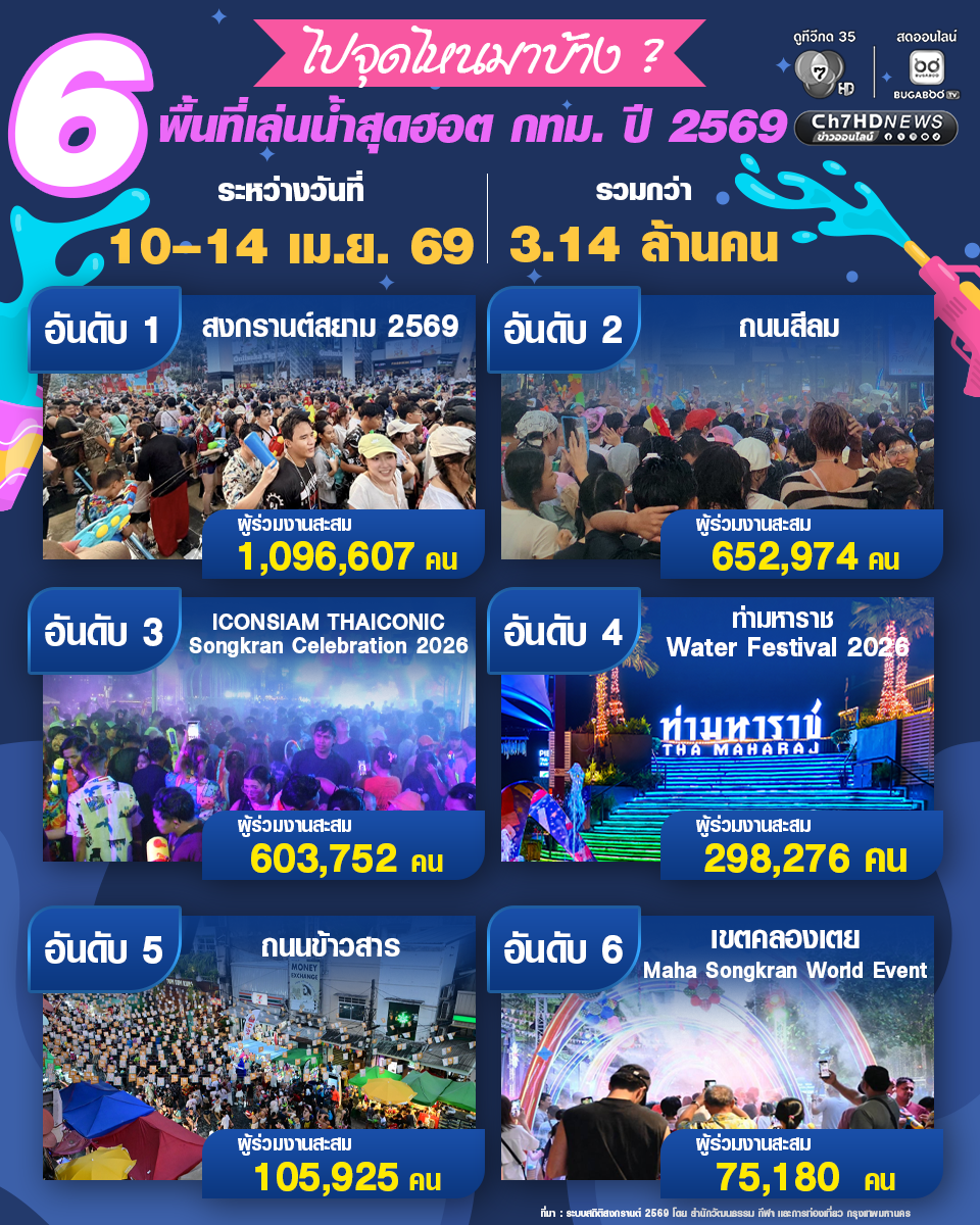 (16 เม.ย. 69) เปิด 6 สถานที่เล่นน้ำยอดฮิต พื้นที่เล่นสงกรานต์ในกรุงเทพมหานคร 2569 โดยสำนักวัฒนธรรม กีฬา และการท่องเที่ยว กรุงเทพมหานคร สรุปสถิติตั้งแต่วันที่ 10-14 เม.ย. 69 รวมมีผู้เล่นน้ำสงกรานต์กว่า 3.14 ล้านคน