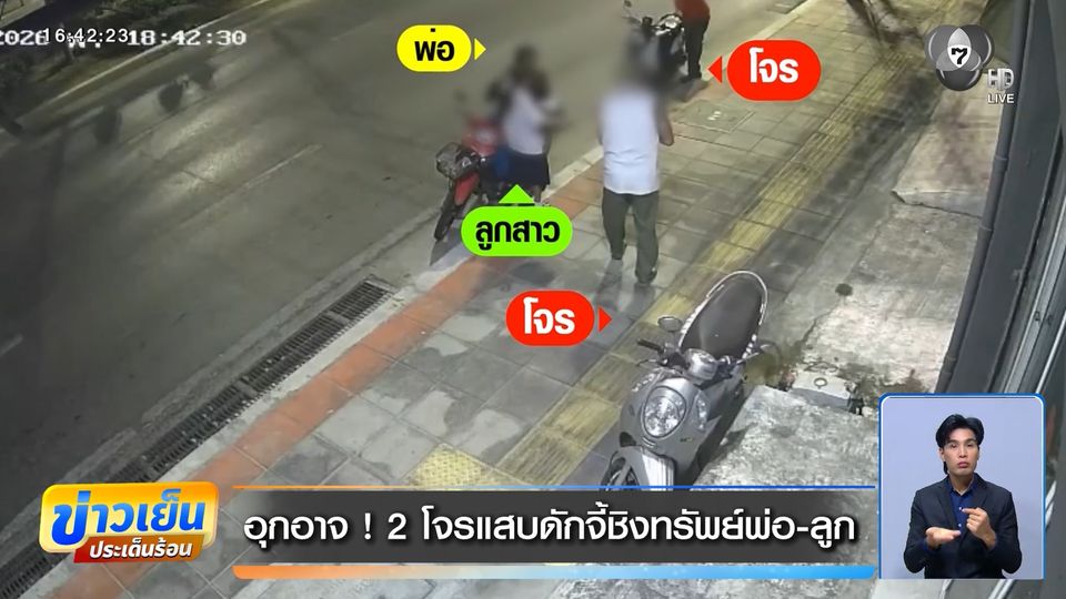 ข่าวเย็นประเด็นร้อน - อันตรายมีอยู่รอบตัว ! ชายคนหนึ่งขี่รถจักรยานยนต์มาพร้อมกับลูกสาว จอดรถแวะซื้อยา เจอชาย 2 คน ดักหน้าดักหลัง ชิงทรัพย์ไปทันที