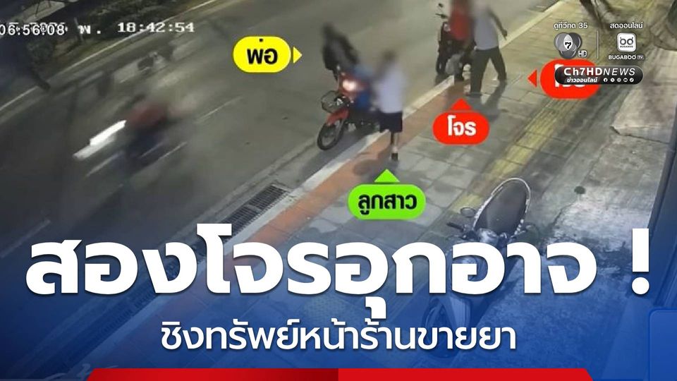 จากนั้นหนึ่งในคนร้ายเสื้อสีขาวแขนสั้น ตีเนียนทำทีเข้าไปพูดคุยกับผู้เสียหาย ก่อนส่งสัญญาณให้คนร้ายเสื้อสีแดง เดินอ้อมมาด้านหลัง ใช้มีดข่มขู่ แล้วฉุดกระชากกระเป๋าไปต่อหน้าต่อตา จนพ่อ-ลูกเกิดอาการหวาดผวา วิ่งหนีแบบไม่คิดชีวิต เหตุเกิดเวลา 18.40 น. วันที่ 15 เมษายน