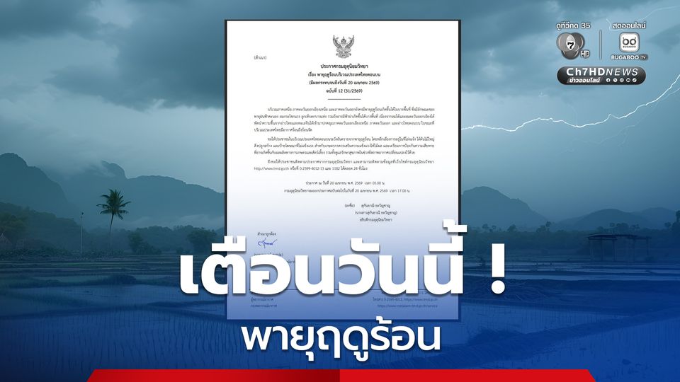 วันนี้ ( 20 เม.ย.69) เวลา 05.00 น. ประกาศกรมอุตุนิยมวิทยา ฉบับที่ 12 เรื่อง พายุฤดูร้อนบริเวณประเทศไทยตอนบน มีผลกระทบจนถึงวันนี้ โดยบริเวณภาคเหนือ ภาคตะวันออกเฉียงเหนือ และภาคตะวันออกยังคงมีพายุฤดูร้อนเกิดขึ้นได้ในบางพื้นที่ ซึ่งมีลักษณะของพายุฝนฟ้าคะนอง ลมกระโชกแรง ลูกเห็บตกบางแห่ง รวมถึงอาจมีฟ้าผ่าเกิดขึ้นได้บางพื้นที่ เนื่องจากลมใต้และลมตะวันออกเฉียงใต้พัดนำความชื้นจากอ่าวไทยและทะเลจีนใต้เข้ามาปกคลุมภาคตะวันออกเฉียงเหนือ ภาคตะวันออก และอ่าวไทยตอนบน ในขณะที่บริเวณประเทศไทยมีอากาศร้อนถึงร้อนจัด