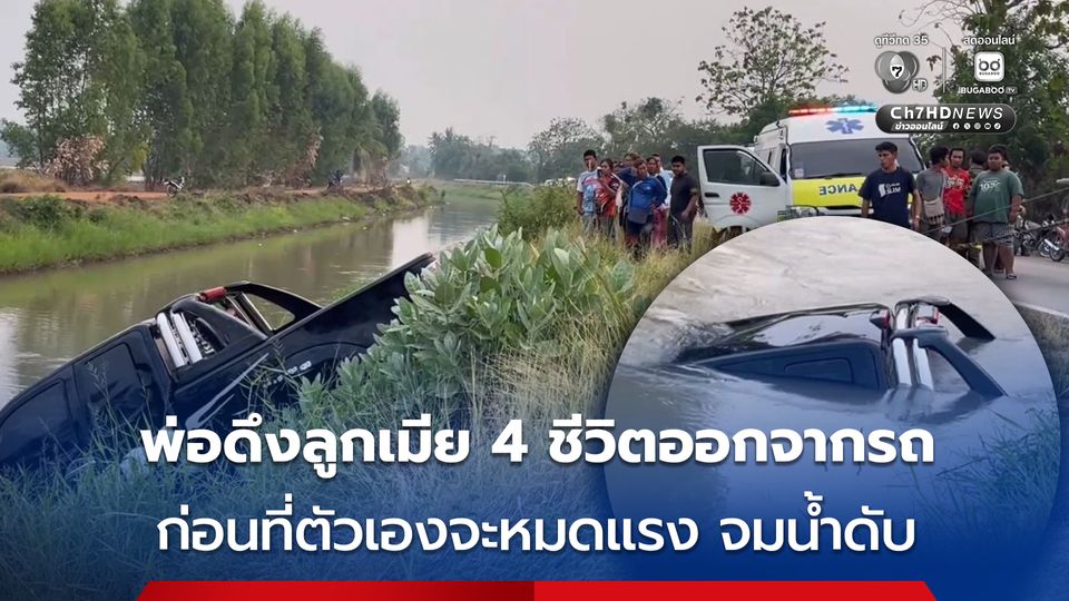 เก๋งตัดหน้ากะทันหัน ทำรถ 5 คน พ่อแม่ลูก หักหลบพุ่งตกน้ำ หลังตกน้ำพ่อช่วยดึงลูกเมีย 4 ชีวิตออกจากรถ และขึ้นจากน้ำได้อย่างปลอดภัย ก่อนที่คนเป็นพ่อจะหมดแรงถูกน้ำพัดไป ก่อนพบร่างไร้วิญญาณ