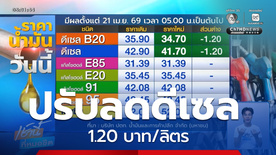 ดีเซล B7 ลงมาอยู่ที่ 41 บาท 70 สตางค์ต่อลิตร โดยทั้ง 2 ชนิดลดลง 1 บาท 20 สตางค์ต่อลิตร ส่วนชนิดอื่น ๆ ยังคงเดิม
