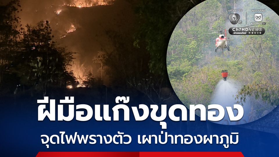 ฝีมือแก๊งขุดทองเถื่อน จุดไฟพรางตัว-ยิงขู่เจ้าหน้าที่ ทำไฟป่าทองผาภูมิลุกลามข้ามไปอุทยานฯ เขาแหลม สถานการณ์เข้าขั้นวิกฤต ระดม ฮ. โปรยน้ำกว่า 7 หมื่นลิตร ห่วงชีวิตสัตว์ป่าหายาก เสือโคร่ง ช้างป่า เสือลายเมฆ เลียงผา