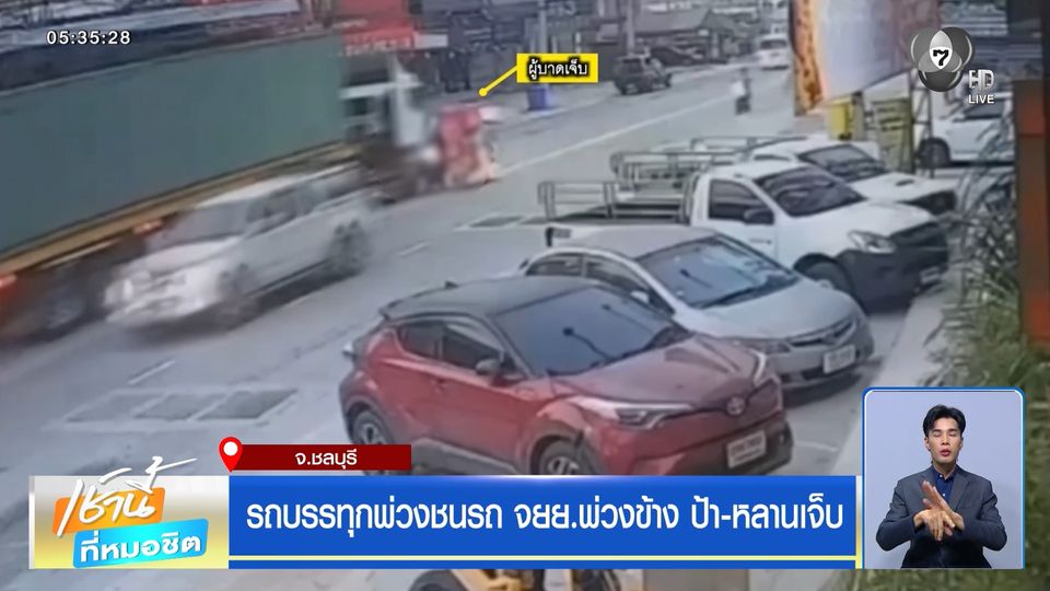 เช้านี้ที่หมอชิต - ที่จังหวัดชลบุรี รถบรรทุกตู้คอนเทนเนอร์พุ่งชนรถจักรยานยนต์พ่วงข้างขายกาแฟและเครื่องดื่มป้าและหลานอาการสาหัส