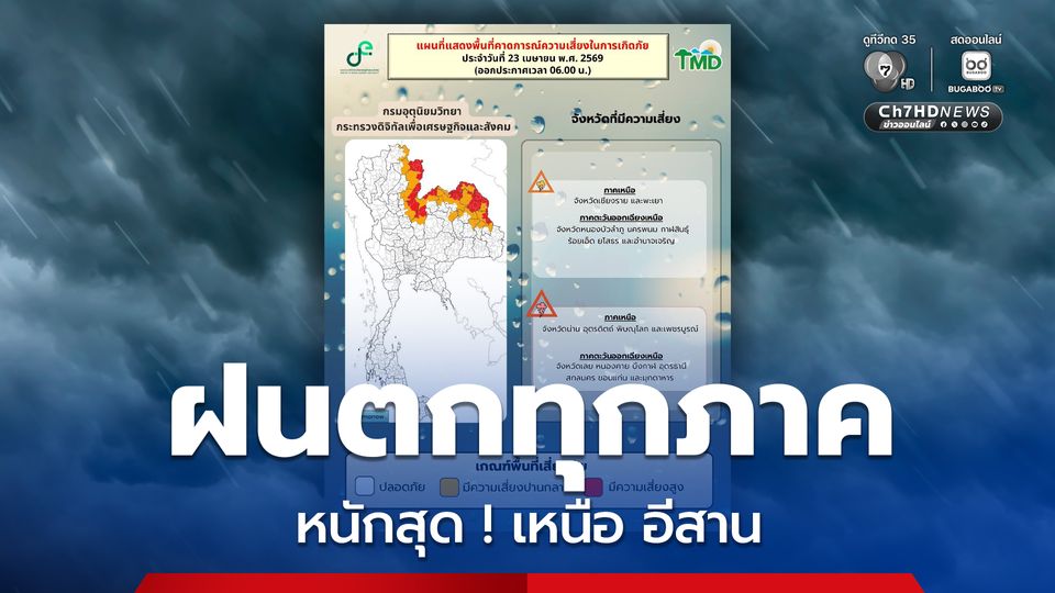 เช้านี้ (23 เม.ย.69) ประกาศกรมอุตุนิยมวิทยา ฉบับที่ 3 ระบุช่วงวันที่ 23–25 เม.ย. 69 ประเทศไทยตอนบนจะมีพายุฤดูร้อนเกิดขึ้น โดยมีลักษณะของพายุฝนฟ้าคะนอง ลมกระโชกแรง ลูกเห็บตก และฝนตกหนักบางแห่ง รวมถึงอาจมีฟ้าผ่าเกิดขึ้นได้บางพื้นที่ โดยจะเริ่มจากภาคเหนือ และภาคตะวันออกเฉียงเหนือก่อน ส่วนภาคกลาง รวมทั้งกรุงเทพมหานครและปริมณฑล และภาคตะวันออก จะได้รับผลกระทบในระยะถัดไป เนื่องจากบริเวณความกดอากาศสูงหรือมวลอากาศเย็นจากประเทศจีนจะแผ่ลงมาปกคลุมภาคตะวันออกเฉียงเหนือและทะเลจีนใต้ ในขณะที่ประเทศไทยตอนบนมีอากาศร้อนถึงร้อนจัดโดยทั่วไป