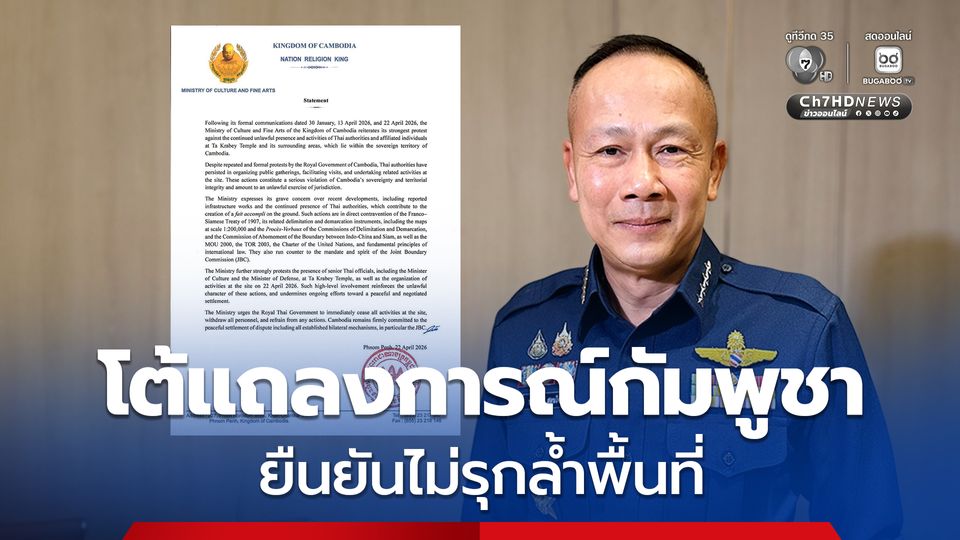 วันนี้ (23 เม.ย. 69) พล.อ.อ.ประภาส สอนใจดี ผู้อำนวยการศูนย์ข่าวสารสถานการณ์ ไทย–กัมพูชา กล่าวถึงกรณีแถลงการณ์ของกระทรวงวัฒนธรรมและวิจิตรศิลป์แห่งราชอาณาจักรกัมพูชา ลงวันที่ 22 เม.ย. ว่า ไทยขอยืนยันข้อเท็จจริงและจุดยืนของประเทศไทย โดยย้ำว่าไทยยึดมั่นถ้อยแถลงร่วมและกฎหมายระหว่างประเทศ