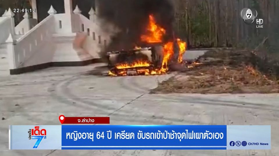 ประเด็นเด็ด 7 สี - เหตุสลดที่จังหวัดลำปาง ! หญิงอายุ 64 ปี เครียดสะสมขับรถกระบะไปจอดข้างเมรุเผาศพในวัด แล้วใช้น้ำมันจุดไฟเผารถคลอกตัวเองเสียชีวิต