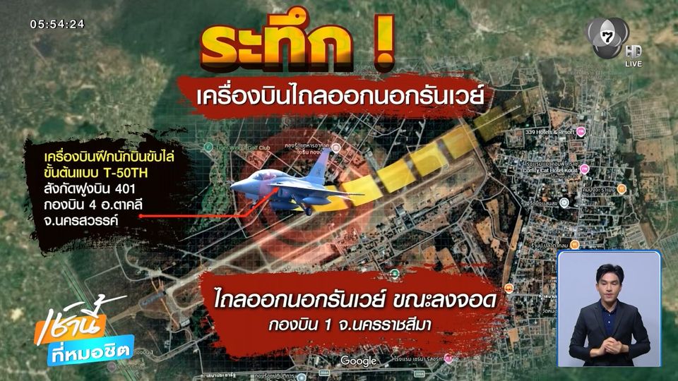 เช้านี้ที่หมอชิต - ระทึก! T-50TH ไถลนอกรันเวย์ขณะลงจอด ที่กองบิน 1 จังหวัดนครราชสีมา นักบินปลอดภัย เจ้าหน้าที่อยู่ระหว่างเร่งสอบหาสาเหตุ