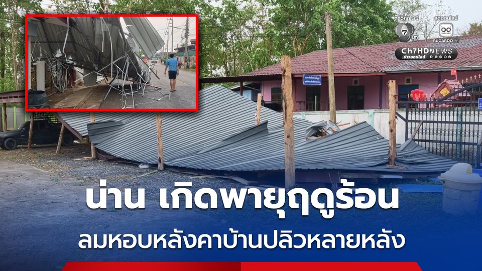 น่าน เกิดพายุฤดูร้อน ลมกระโชกแรง บางแห่งมีลูกเห็บตก ต้นไม้หักโค่นทับสายไฟ บ้านชาวบ้านถูกลมพัดหลังคาปลิวหลายหลัง