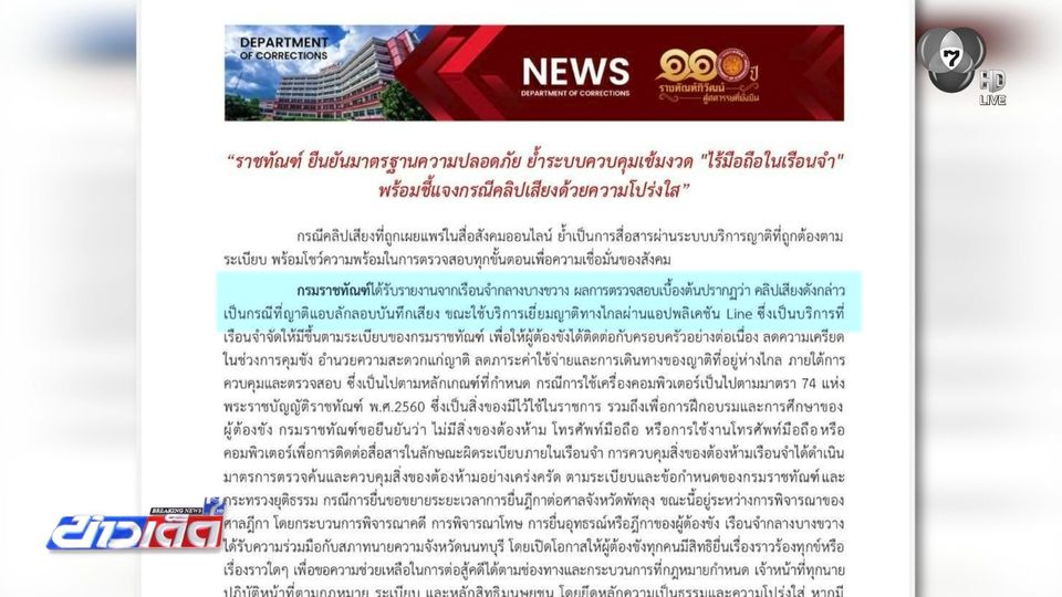 ข่าวเด็ด 7 สี - กรมราชทัณฑ์ สั่งตรวจสอบกรณีคลิปเสียง "แป้ง นาโหนด" พบเป็นการแอบบันทึกจากการเยี่ยมญาติทางไกลผ่านช่องทาง "ไลน์" พร้อมชี้แจงทุกประเด็นที่มีข้อสงสัย
