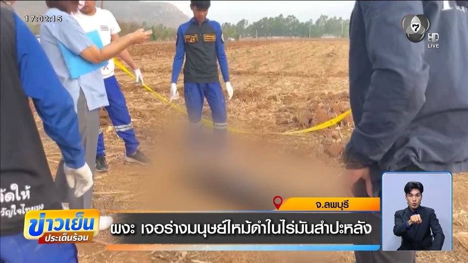 ข่าวเย็นประเด็นร้อน - เจ้าของไร่มันสำปะหลัง ที่จังหวัดลพบุรี เตรียมไถปรับพื้นที่ต้องผงะ เพราะไปเจอร่างมนุษย์ที่ถูกสัตว์กัดแทะ ทิ้งปมปริศนาเสื้อผ้าถูกถอดทิ้ง ตำรวจเร่งสอบสวน สาเหตุการตาย และในพื้นที่ไม่มีผู้แจ้งความคนหาย