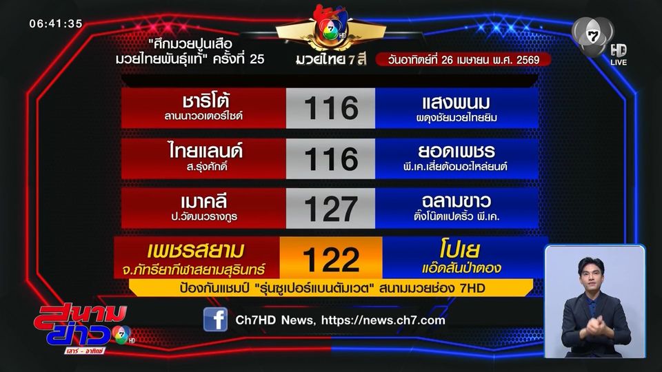 โปรแกรมมวยไทย 7 สี วันอาทิตย์ที่ 26 เมษายน 2569 ถ่ายทอดสดช่อง 7HD เวลา 14.30 น.