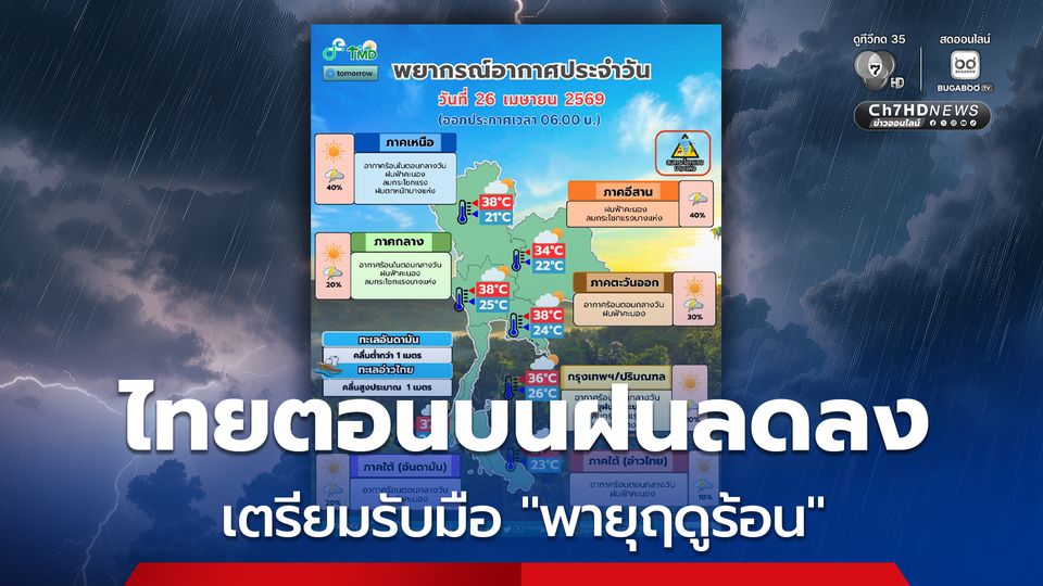 วันนี้ (26 เม.ย. 69) เพจเฟซบุ๊ก กรมอุตุนิยมวิทยา รายงานถึงสภาพอากาศวันนี้ ประเทศไทยตอนบนจะเริ่มฝนลดลง แต่ยังคงมีฝนฟ้าคะนอง ลมกระโชกแรงบางแห่ง และฝนตกหนักได้บางพื้นที่บริเวณภาคเหนือ เนื่องจากบริเวณความกดอากาศสูงหรือมวลอากาศเย็นปกคลุมประเทศไทยตอนบนและทะเลจีนใต้ ส่งผลทำให้มีลมใต้และลมตะวันออกเฉียงใต้พัดนำความชื้นจากอ่าวไทยและทะเลจีนใต้เข้ามาปกคลุมภาคตะวันออกเฉียงเหนือ ภาคเหนือ ภาคกลาง รวมทั้งกรุงเทพมหานครและปริมณฑล และภาคตะวันออกมีกำลังอ่อนลง