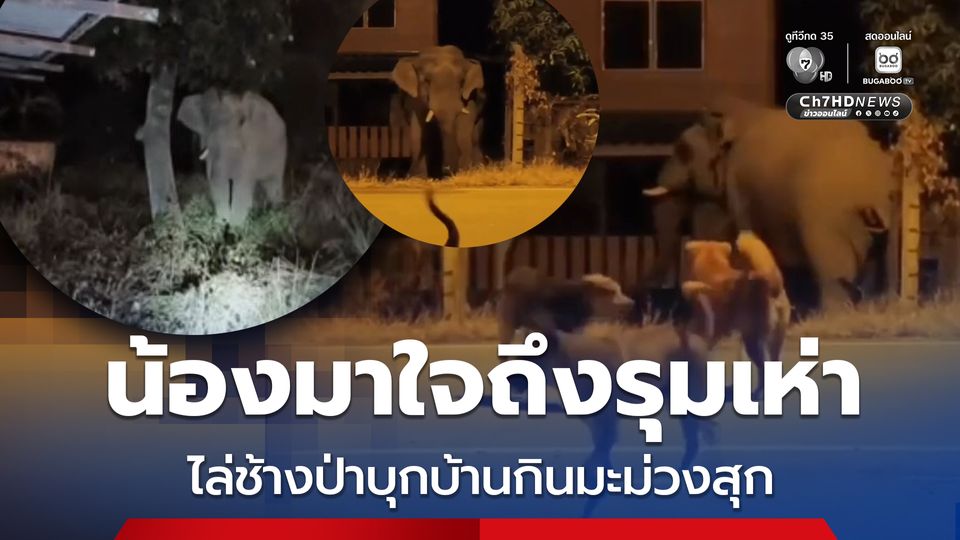 น้องหมาใจถึง พึ่งได้ ช่วยกันรุมเห่าไล่ช้างป่าฤาไน หิวโซ ย่องเงียบเข้าบ้านใจกลางชุมชนบ้านเทพประทาน ใช้งวงเขย่าต้นมะม่วง เลือกกินลูกสุกเกือบหมดต้น