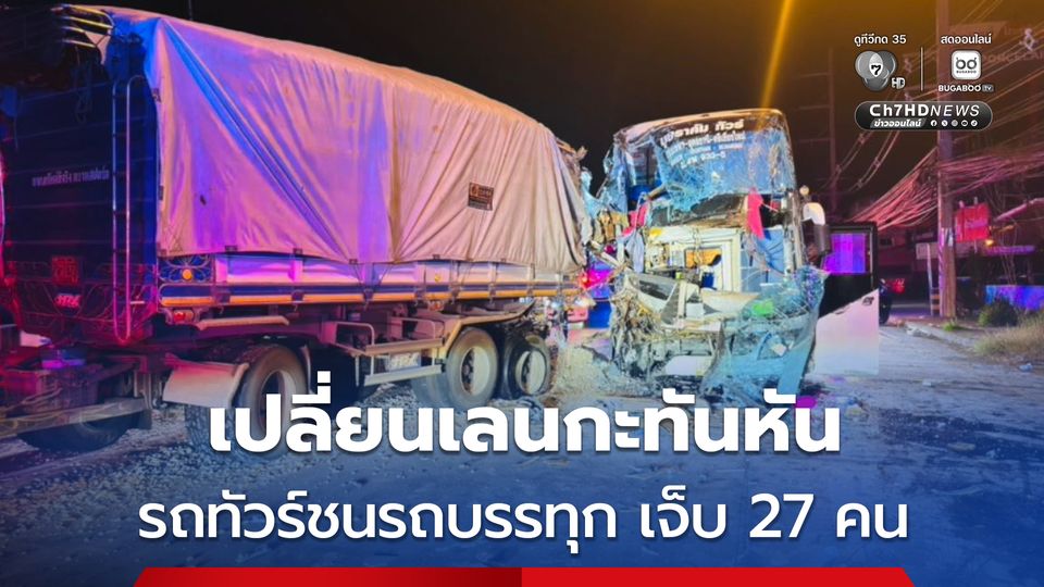 อุบัติเหตุรถทัวร์โดยสารชนท้ายรถบรรทุกพ่วง มีผู้ได้รับบาดเจ็บ 27 คน ข้อมูลจากรถทัวร์ ระบุ รถบรรทุกพ่วงได้เปลี่ยนเลนกะทันหัน ทำให้รถทัวร์โดยสารที่มาเลนขวาเบรกไม่ทัน จึงพุ่งเข้าอย่างจัง