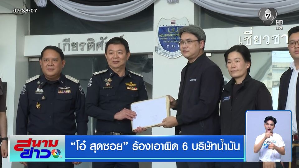 สนามข่าว 7 สี - รัฐมนตรีฯ พลังงาน มอบหมาย "โอ๋ สุดซอย“ และทีมกฎหมายกรมธุรกิจพลังงาน ร้องทุกข์ดีเอสไอ ดำเนินคดี 6 บริษัทคลังน้ำมัน ในจังหวัดระยอง และชลบุรี โยงพฤติการณ์ออกใบกำกับการขนส่งน้ำมันเชื้อเพลิงทางเรือไม่ถูกต้อง 166 ใบ