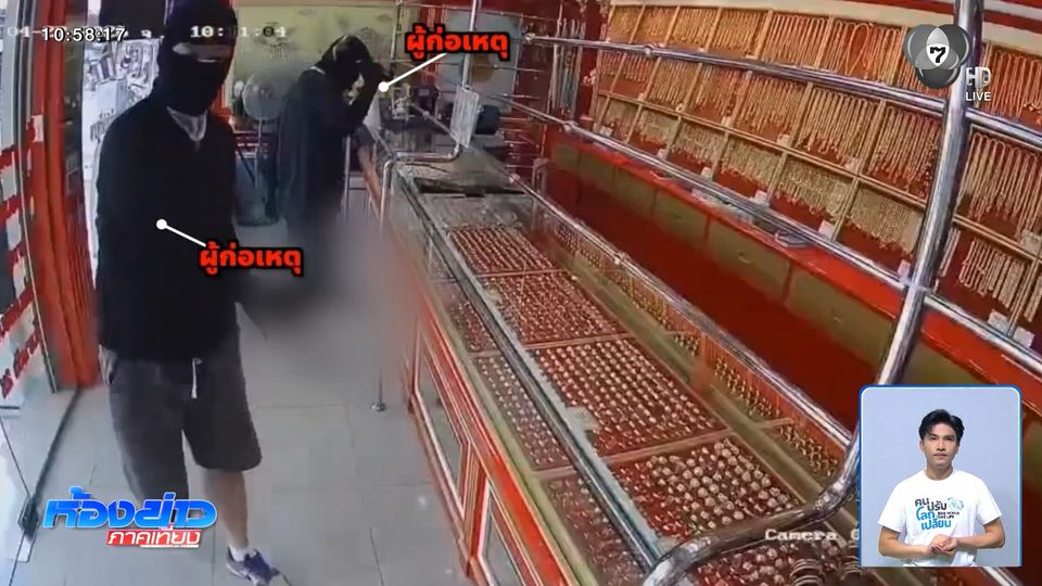 เป็นภาพขณะที่ชาวจีน 2 คน สวมหมวกไอ้โม่งบุกเข้าไปในร้านทอง ตำบลด่านเกวียน อำเภอโชคชัย จังหวัดนครราชสีมา คนหนึ่งถือปืนข่มขู่พนักงาน อีกคนใช้ค้อนทุบตู้กระจกแตก คนร้ายช่วยกันหยิบแหวนทองในตู้ เดินออกจากร้านขึ้นรถเก๋งสีขาว หลบหนีไป เหตุเกิดช่วง 10.00 น. วานนี้ (27 เม.ย.)