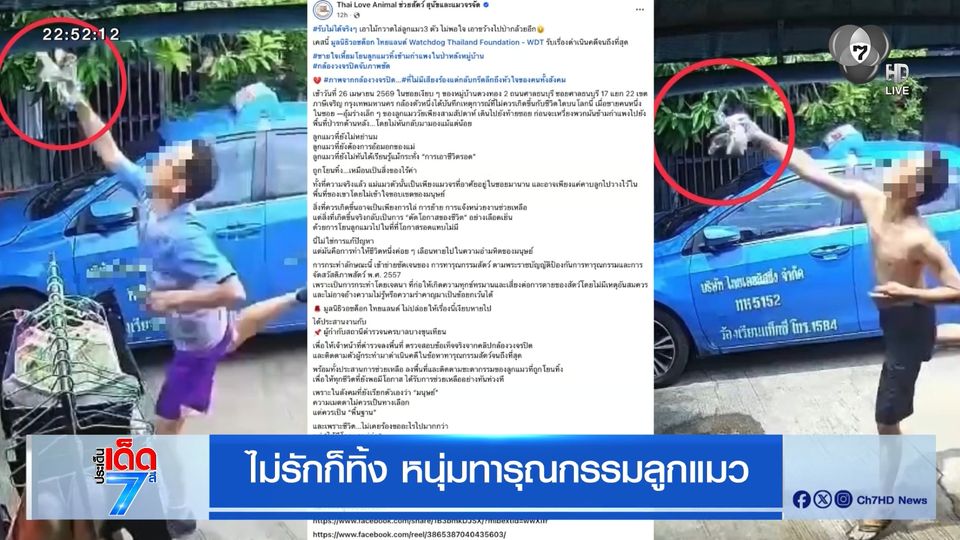 ประเด็นเด็ด 7 สี - สะเทือนใจทาสแมว ! ไม่รักก็โยน หนุ่มคนหนึ่งมีพฤติกรรมทารุณกรรมสัตว์ จับลูกแล้วโยนข้ามกำแพงเพราะขวางหน้าบ้าน