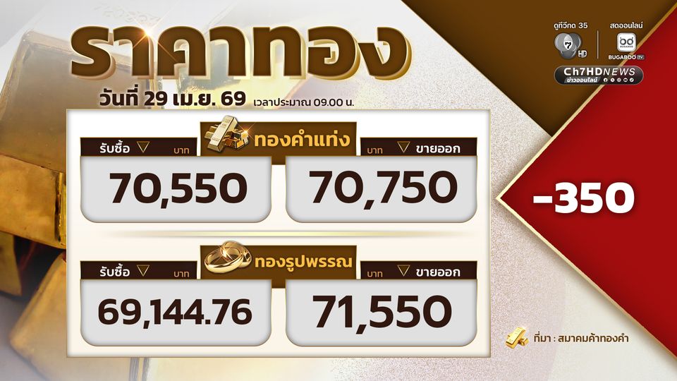 ราคาทอง โดยสมาคมค้าทองคำ รายงานราคาทองวันนี้ (29 เม.ย. 69) เปิดตลาดราคาทอง ราคาทองปรับลง 350 บาท ขายออกที่บาทละ 70,750 บาท โดยทองคำแท่งรับซื้อที่ 70,550 บาท ขายออกที่ 70,750บาท ทองรูปพรรณรับซื้อที่ 69,144.76 บาท ขายออก 71,550 บาท