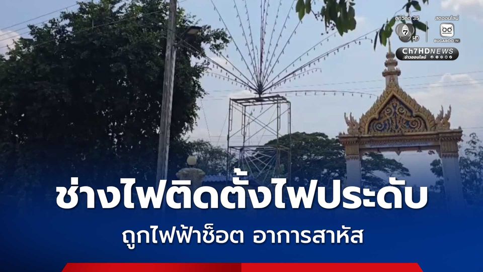 อุทาหรณ์ ! หนุ่มช่างไฟวัย 34 ปี ขึ้นนั่งร้านเหล็กไปติดตั้งไฟประดับงานฉลองภายในวัด ก่อนไม้ไผ่ของไฟประดับภายในมือไปโดนสายไฟฟ้าแรงสูง จึงถูกไฟฟ้าช็อตนอนแน่นิ่งบนนั่งร้านอาการสาหัส